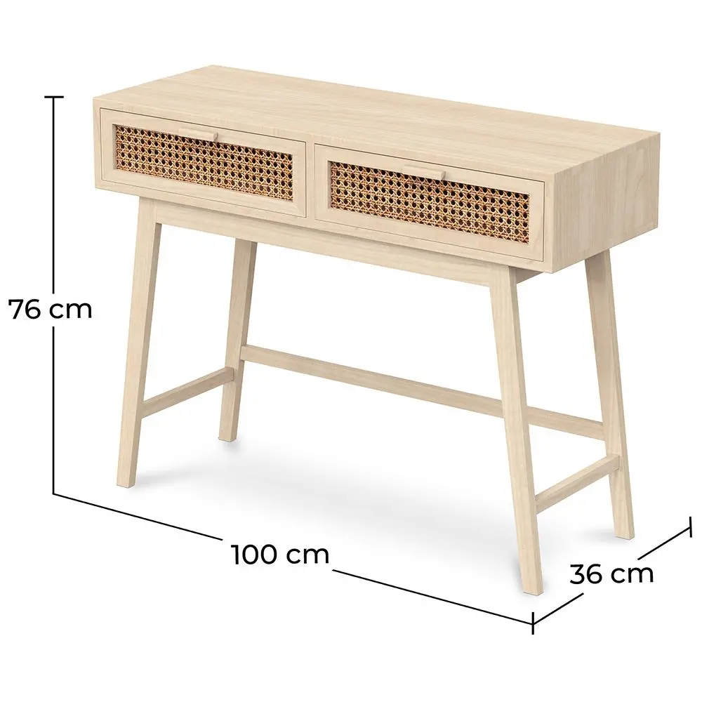 La consolle per l'ingresso Hanay in cannage a 2 cassetti è un mobile in legno dallo stile boho originale e unico. Ideale per arredare la casa, sarà ottimale anche per il vostro hotel, una sala, la vostra attività o uno spazio commerciale. Accoglierà con un tocco di stile ed eleganza i vostri ospiti, consentendo di appoggiare o riporre chiavi, borse e altri piccoli oggetti. Il design complessivo, che si adatta a ogni stile di arredamento, rende questo mobile un elemento decorativo molto interessante a livello estetico. La qualità premium dei materiali utilizzati garantisce una lunga durata del prodotto.