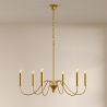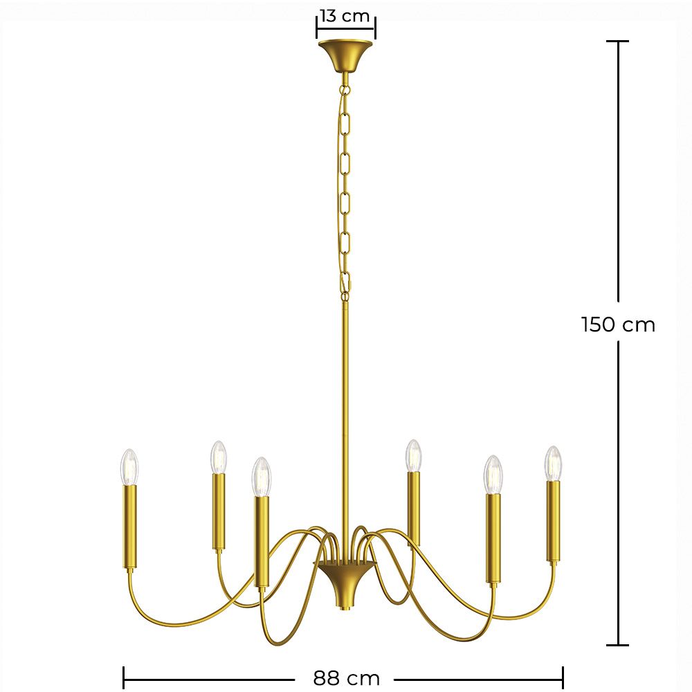 Eleva la decorazione della tua casa con questa elegante lampada a sospensione in finitura oro satinato, progettata per risaltare in sale da pranzo, soggiorni, ingressi o spazi con soffitti alti. Ispirata ai classici lampadari, questa illuminazione con 6 bracci curvi combina fascino tradizionale ed estetica sofisticata e contemporanea.