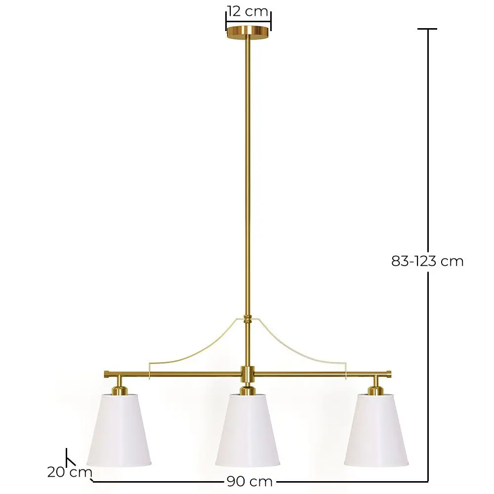 Dona un tocco di eleganza e calore alla tua casa con questa lampada a sospensione da soffitto realizzata in metallo dorato anticato, un pezzo sofisticato che unisce design classico e funzionalità moderna. La sua struttura lineare sorregge tre paralumi in tessuto bianco, che diffondono delicatamente la luce creando un'atmosfera avvolgente, perfetta per sala da pranzo, soggiorno o cucina.