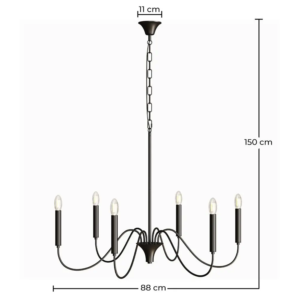 Aggiungi un tocco elegante e contemporaneo a qualsiasi spazio con questa lampada a sospensione in metallo color nero opaco, ispirata al design classico dei lampadari. Con sei bracci curvi, questa lampada combina estetica tradizionale con uno stile moderno e minimalista, ideale per sale da pranzo, soggiorni, ingressi o spazi con soffitti alti.
