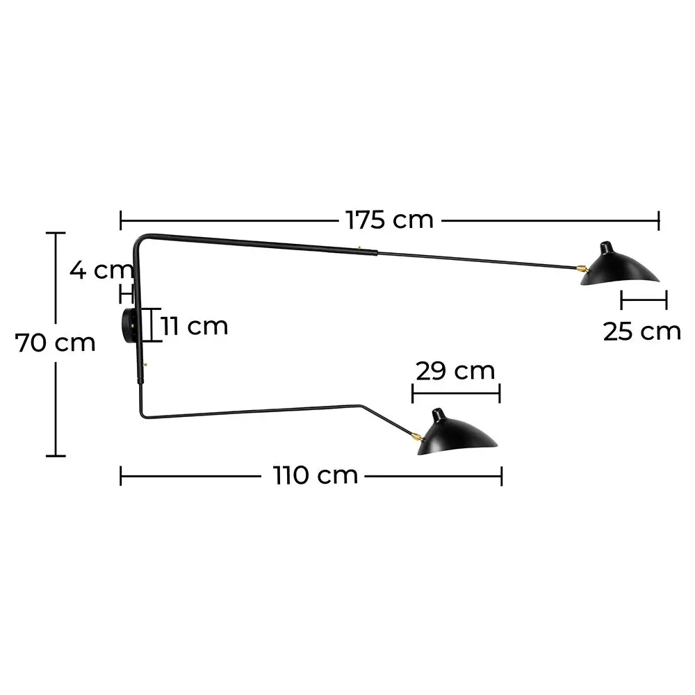 La lampada da parete MRZ-R2C è composta da due bracci con due paralumi rotanti che permettono di controllare la diffusione della luce verso il punto desiderato.