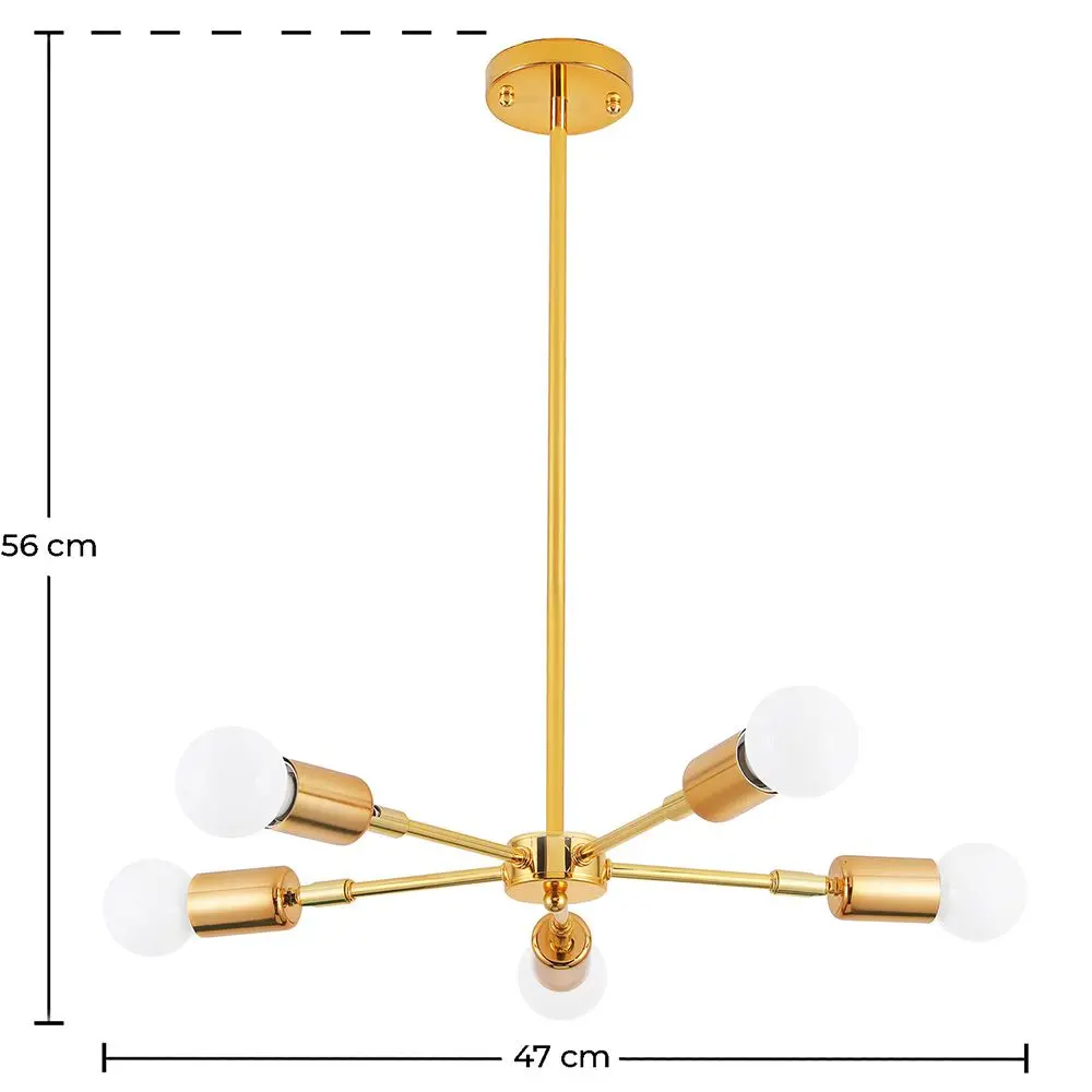 Lampadario pendente a 5 raggi, fatto in ottone, dal design raffinato e moderno. Si adatta bene sia a uno stile di arredamento classico che moderno. Sarà perfetto per la cucina, il salotto, la camera da letto e qualunque altro ambiente interno, che contribuisce a completare con bellezza ed eleganza.