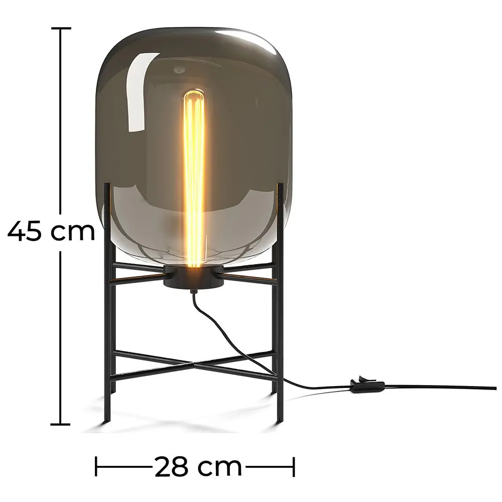 Porta a casa tua questa lampada da tavolo e usala per dare uno stile unico alla tua scrivania o al comodino vicino al letto. Ha un paralume disponibile in vetro ambrato o in vetro fumè, che poggia su una struttura di acciaio nero. Il suo design industriale le da un aspetto squisitamente retrò ed estremamente versatile, capace di abbinarsi bene a stili e materiali diversi. Siamo certi che la adorerai.