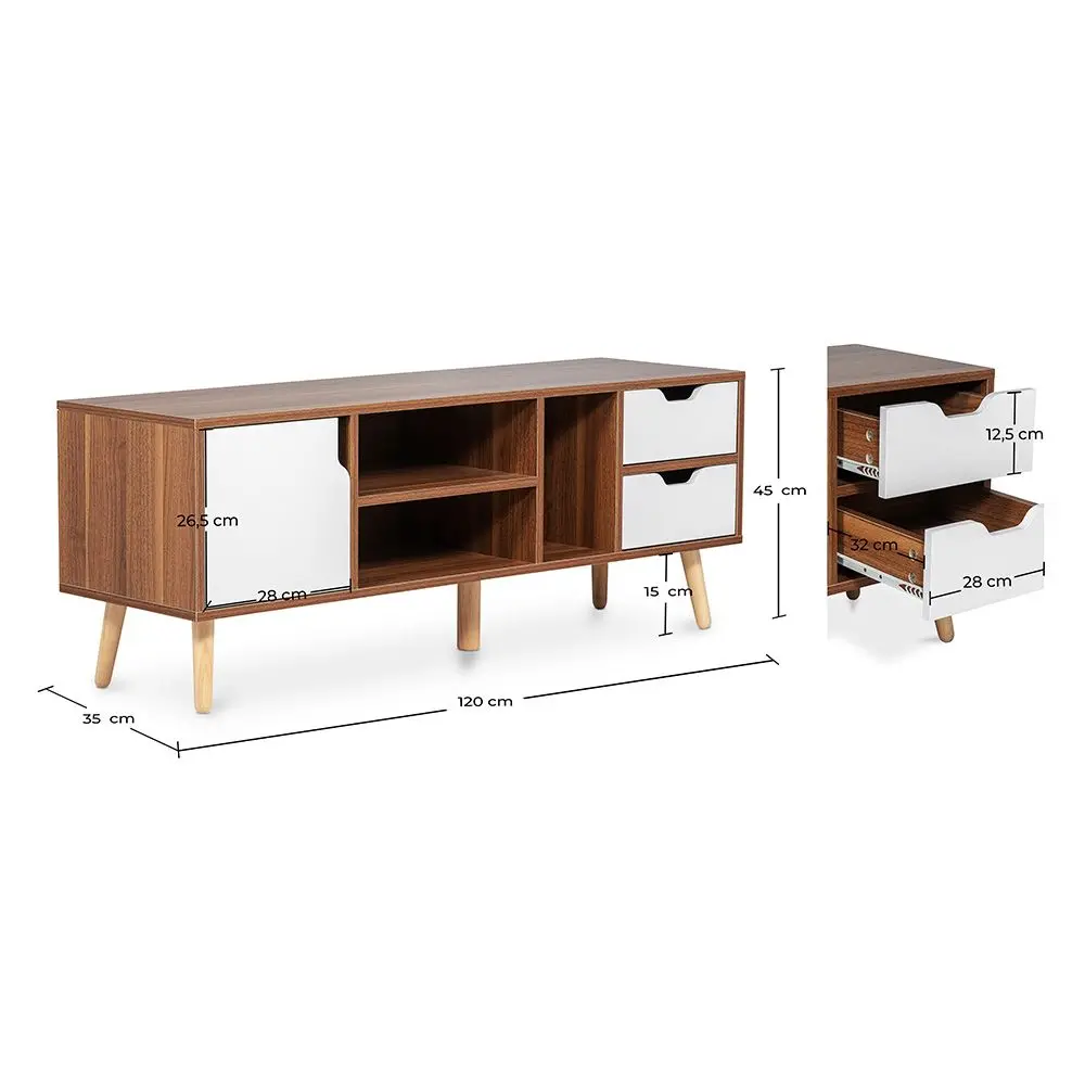 Siamo certi che adorerai questa Mueble de TV. Ha uno stile nordico piacevolmente semplice e funzionale, e può aiutarti sia a dare un tocco vintage al tuo salotto, sia a riordinare le cose a cui tieni di più. La struttura è fatta di truciolato, mentre le gambe sono in solido legno di pino. È composta da un armadietto, due scaffali e due cassetti che creano un vivace gioco di colori, capace di potrare più allegria qualsiasi stanza. Non vorrai più farne a meno!
