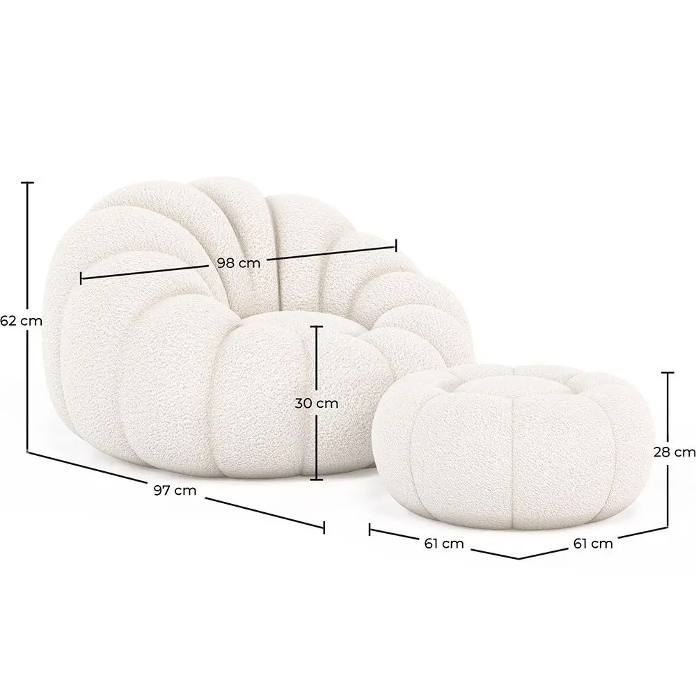 Calera è una meravigliosa poltrona pouf, un complemento d'arredo ideale da posizionare nel tuo soggiorno, nel salotto, nell'ufficio, in una sala d'attesa e ovunque tu voglia. Ha un'imbottitura morbida in schiuma e un rivestimento in bouclé estremamente resistente, con una consistenza che sarà un vero piacere anche al tatto, oltre che alla vista. Lascia che riempi con la sua bellezza l'ambiente in cui deciderai di collocarla.