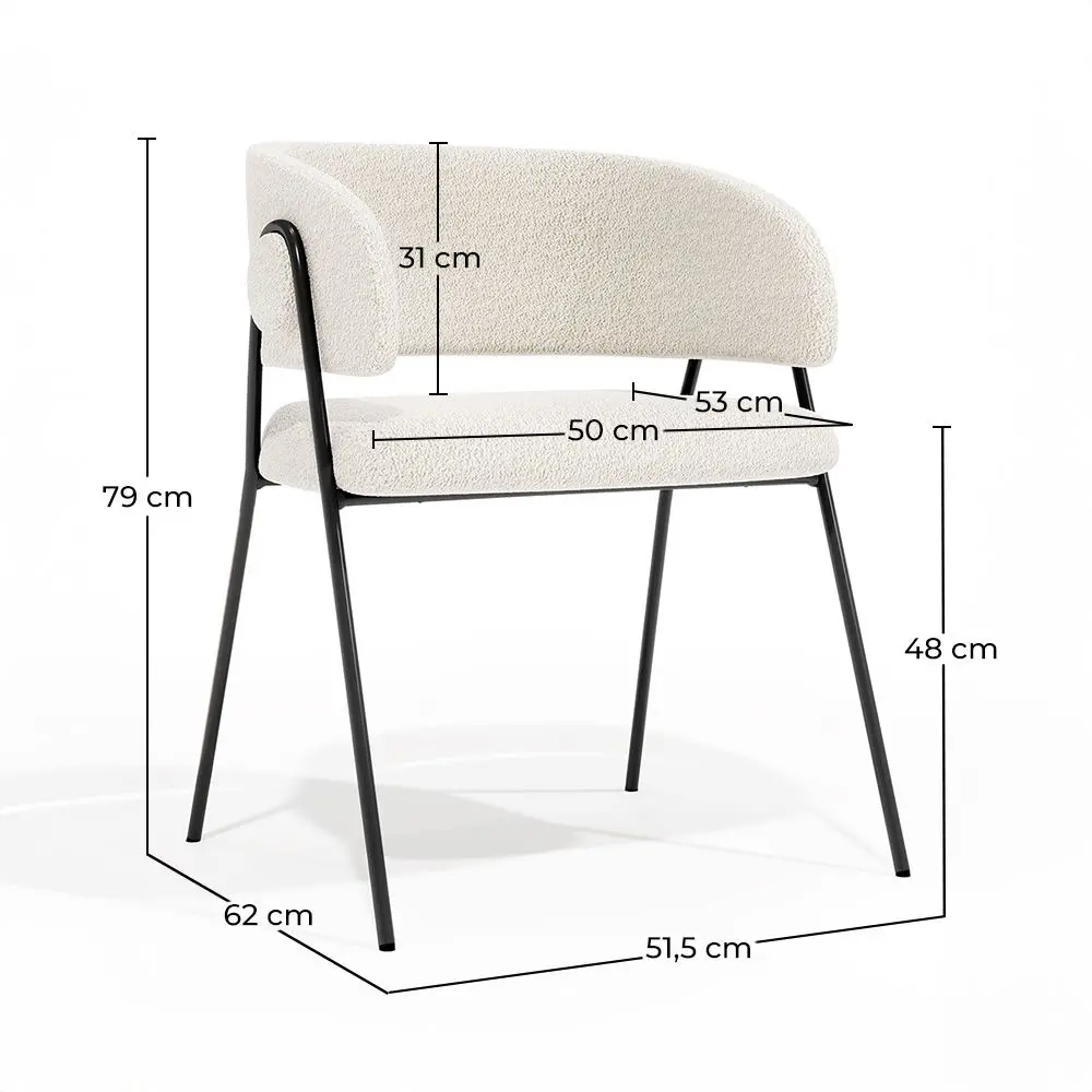 La combinazione tra rivestimento in bouclé e gambe in metallo nero crea un'estetica equilibrata e armoniosa. La nostra sedia Manar si adatta a una varietà di stili decorativi, dal contemporaneo al classico, e diventa il punto focale di ogni sala da pranzo. Le gambe in metallo dal tono champagne morbido e sofisticato conferiscono un aspetto moderno e raffinato. Il metallo è noto per la sua resistenza e durata, garantendo una sedia robusta e resistente che può sopportare l'uso quotidiano senza perdere il suo fascino. Il rivestimento in bouclé aggiunge un tocco di texture e morbidezza, creando un'esperienza visiva e tattile unica. Le delicate e intrecciate anse del tessuto bouclé offrono una sensazione lussuosa e piacevole durante la seduta, trasformando ogni pasto in un momento di comfort e relax.