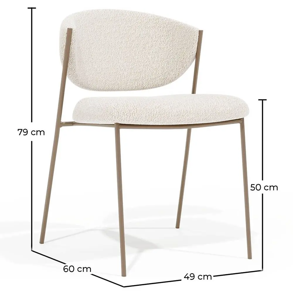 La sedia da pranzo tappezzata in tessuto bouclé con una struttura metallica color champagne è un pezzo elegante e versatile che combina perfettamente stile e funzionalità. La tappezzeria in tessuto bouclé le conferisce un aspetto testurizzato e sofisticato, aggiungendo un tocco di calore e comfort. La sua costruzione in metallo garantisce una durata eccezionale, rendendola una scelta ideale sia per hotel e ristoranti che per uso residenziale. Lo schienale avvolgente della sedia offre un supporto ergonomico e confortevole, rendendo questa sedia di design una scelta perfetta per hotel e ristoranti.