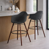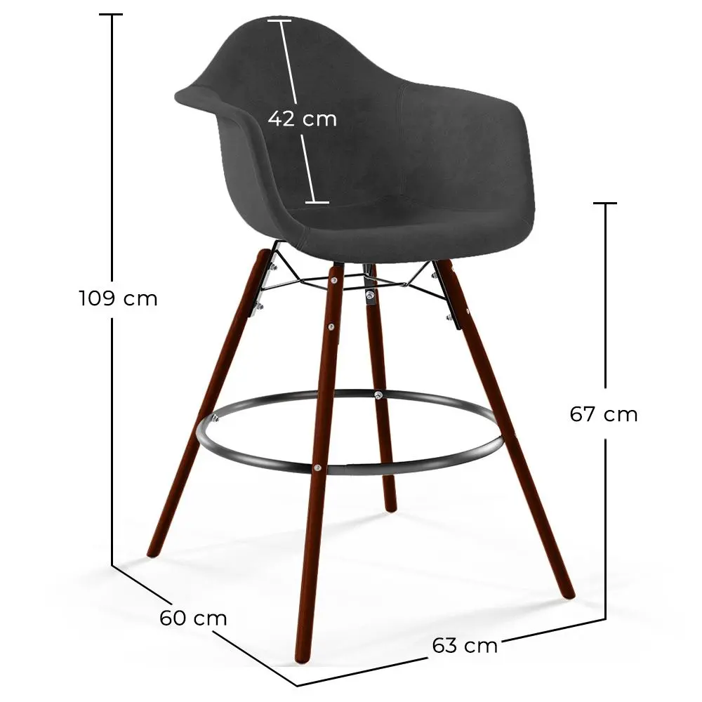 Trasforma il tuo bar o la tua cucina con questo sgabello in velluto, che unisce design e comfort in un modello unico. Presenta gambe in legno di faggio scuro e un anello circolare per appoggiare le gambe, offrendo sostegno e stile in un unico pezzo d’arredo, perfetto per ambienti contemporanei e minimalisti.