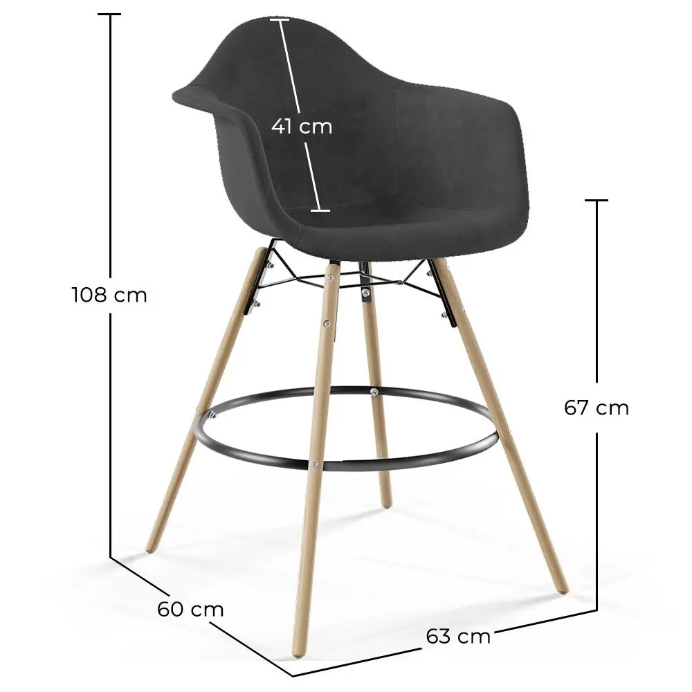 Rinnova il tuo spazio con questo sgabello da bar in velluto, progettato con gambe in legno dal tono chiaro e un barra circolare per un maggiore comfort. Perfetto per banconi in stile minimalista o naturale, la sua struttura robusta e il design raffinato offrono una combinazione unica di funzionalità e stile.