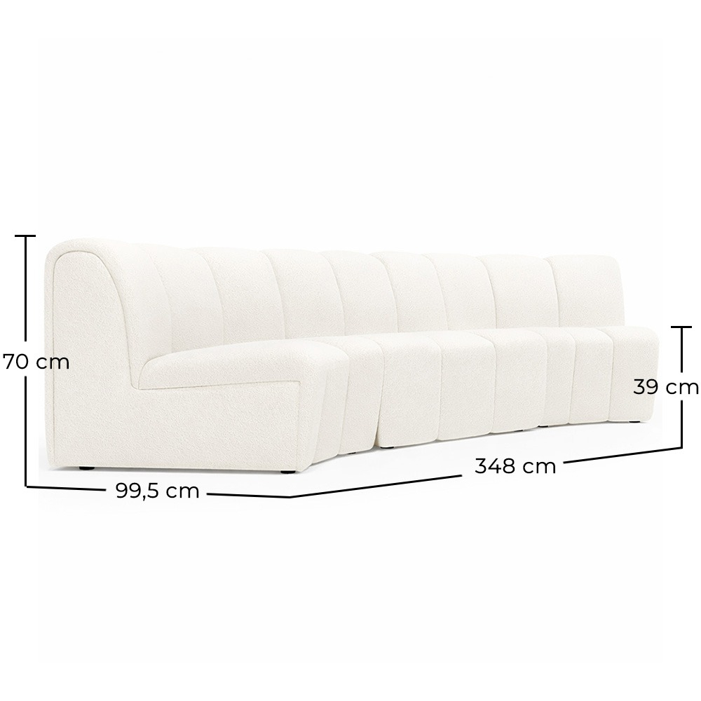 Immergiti nel lusso e nella sofisticatezza con il nostro esclusivo design di divano modulare. Rivestito in bouclé bianco morbido, ogni modulo di questo divano è un'opera d'arte minimalista che si integra perfettamente con una struttura in legno massello. Il suo design curvo aggiunge un tocco di eleganza moderna, ideale per distinguersi nell'ambiente di qualsiasi hotel di alto livello. Con il suo stile minimalista e il comfort impareggiabile, questo divano offre un'esperienza di lusso senza precedenti per gli ospiti più esigenti.