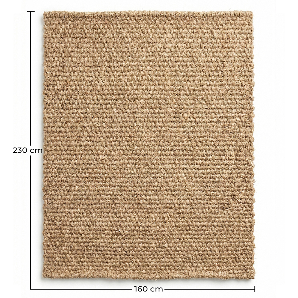 Grazie alle sue dimensioni di 230x160cm, è ideale come tappeto da soggiorno, tappeto per terrazza coperta, tappeto da veranda, tappeto da ingresso o anche come tappeto decorativo per sala da pranzo. La sua finitura in tono naturale si fonde facilmente con stili nordici, rustici, mediterranei o boho.